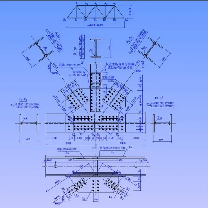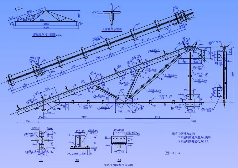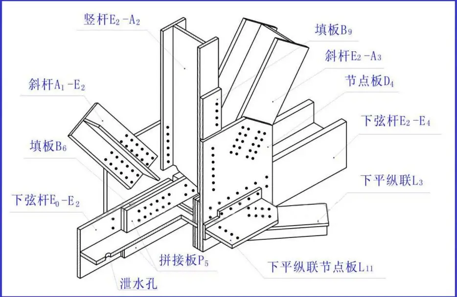 节点板、杆件、断面采用较大比例(1:10,1:5)